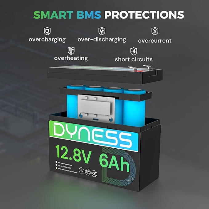 - 【All-in-One Safety Shield BMS】Dyness LiFePO4 battery with smart 6A BMS provides comprehensive protection against overcharging, over-discharging, overcurrent, overheating, and short circuits, along with dust resistance, salt spray resistance and IP65 waterproofing. Engineered for energy stockage, fish finder, lighting , kids car, lawn mower, alarm system or used as backup power supply etc.