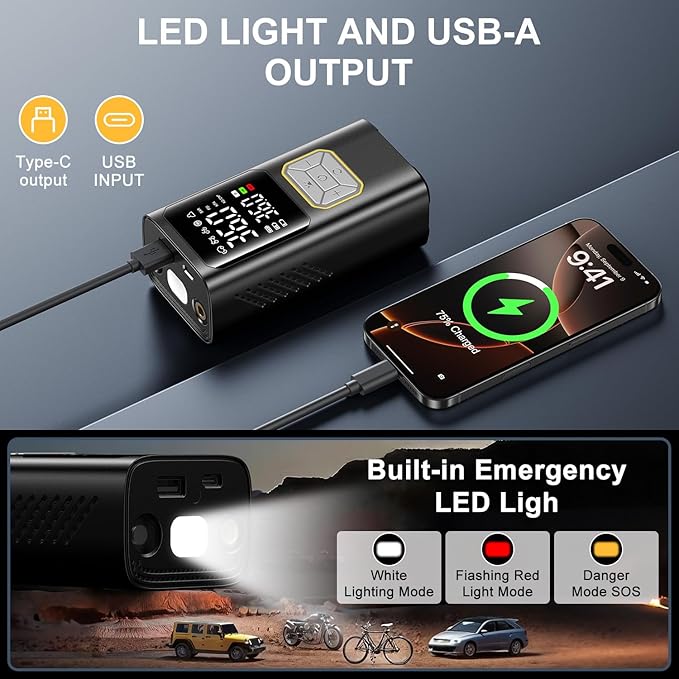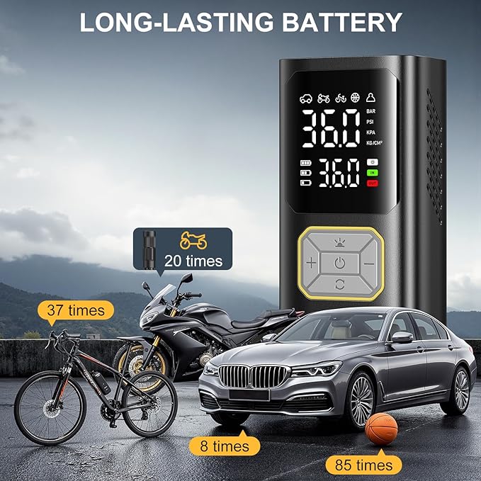 - [Usage Recommendations] Not suitable for heavy-duty tires. Store the air compressor in a cool, dry place, away from direct sunlight. For long-term storage, charge it every 3 months to prolong battery life.