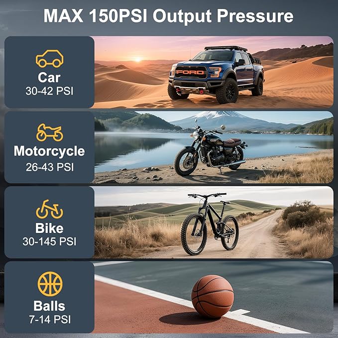 - [Quick Inflation] Never worry about tire inflation during your travels again with this portable air pump. With a maximum pressure of 150 PSI, it quickly inflates your car tires and motorcycle tires in just minutes, providing a fast and efficient solution to keep you on the road. Stay ready for any journey with this reliable tire inflator and compressor.