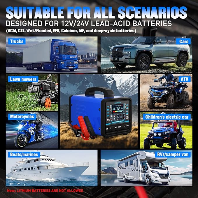 - 【Professional-Grade Battery Charger】Engineered with military-grade 13.1LB pure copper coils and heavy-duty aluminum alloy casing, the Yourheey Car Battery Charger delivers unmatched durability and 30% faster heat dissipation. This 12V 24V Battery Charger Automotive masterfully handles all lead-acid battery types - AGM, GEL, Flooded, EFB, Calcium, MF, and deep-cycle batteries (Note: Not compatible with lithium/LiFePO4). Its 20A max output ensures rapid charging for trucks/RVs while maintaining precision for motorcycles/lawn equipment. car battery charger heavy duty battery maintainer trickle charger