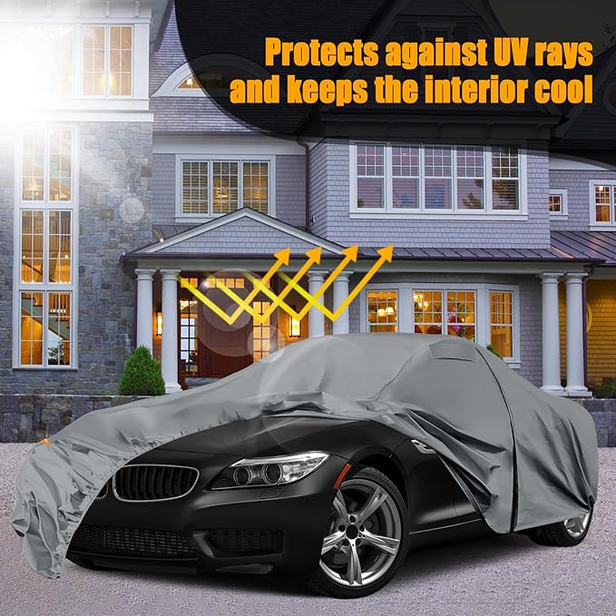 - Premium Material: Outermost Made of High-density Multilayers Polyester&PU composite material, Plus waterproof coating Polyethylene to ensure it 100% waterproof, and can withstands long summer sun exposure and winter rain/snow. Adding High reflective aluminum is good at sunproof, keeps car cool in the sunny day. Inner soft thick cotton liner to protect your car's painting