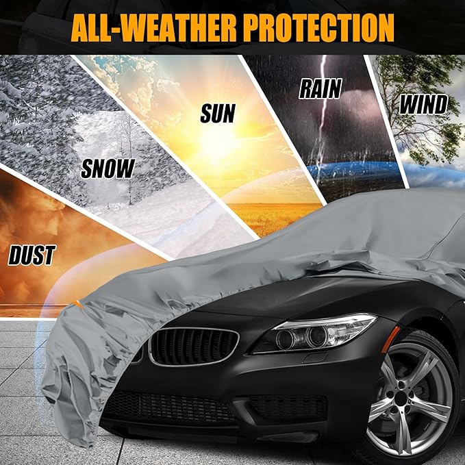 - All Weather Car Cover: Sportuli Car Covers can handle it all no matter hot sun or cold weather. The strengthful material keeps your car safe from sun, snow, frost, rain, sand, dust, leaves, branches and birds dropping