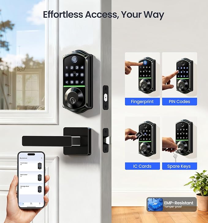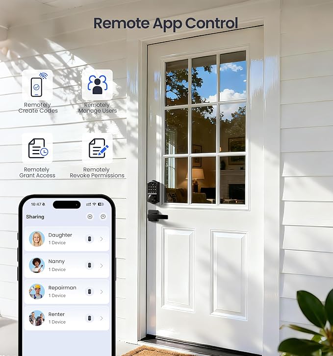 - 7-in-1 Smart Door Lock with Handle Set: Unlock via fingerprint, App, authorized access, Fobs, PIN code, code sharing, or mechanical key — ideal for homes, offices, or rentals