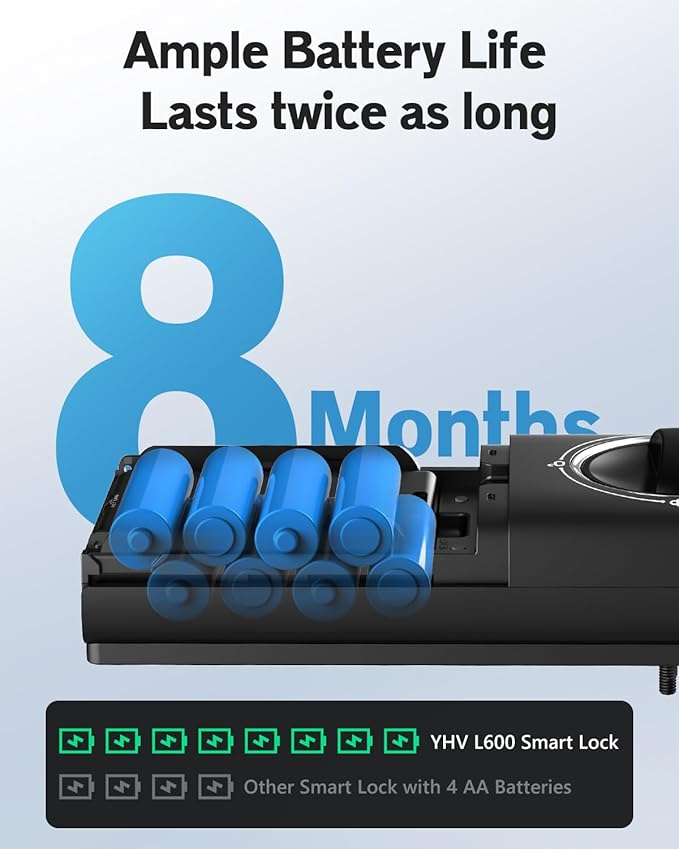 - Reliable Power Supply: The deadbolt lock runs on 8 AA batteries, typically lasting up to 8 months, and sends proactive low-battery alerts. Includes an external USB-C port for emergency charging when the battery is depleted, and our system enters ultra-low power mode during inactivity.