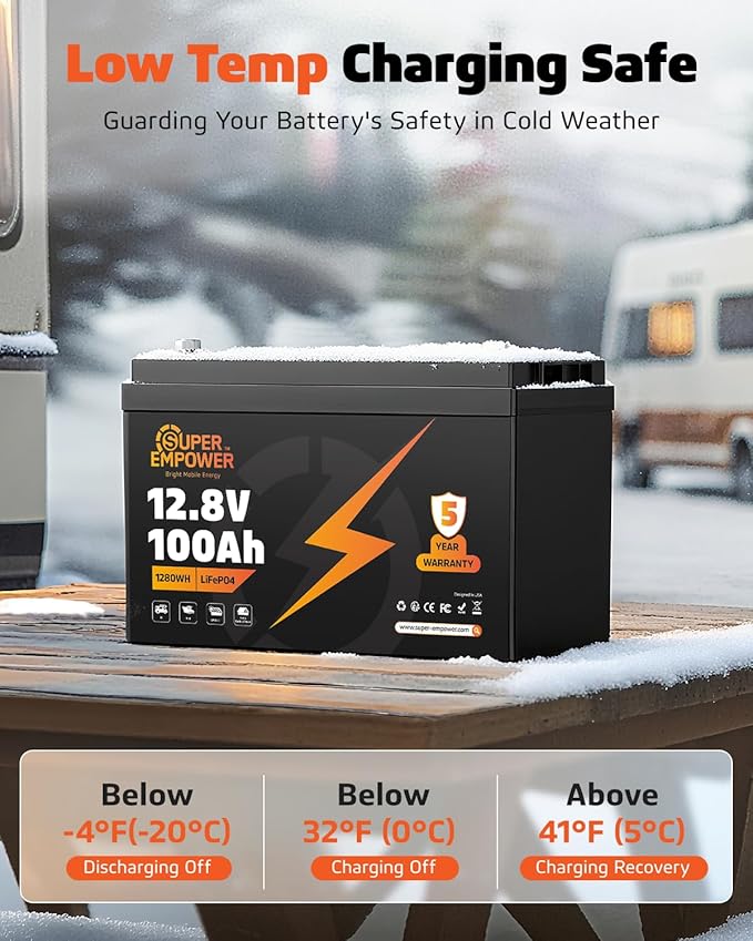 - 【Low-Temp Charging Protection】 Intelligent protection prevents charging below 0°C (32°F) and stops discharge at -20°C (-4°F), resuming above 5°C (41°F). Specially engineered for cold climates, this feature safeguards the LiFePO4 lithium battery, avoids winter charging damage, and ensures long service life. Perfect for RV, cabin, off-grid solar, and marine battery use, it delivers dependable power even in freezing conditions.