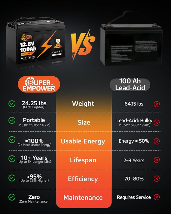 - 【Exceptional Deep Cycle Performance】The 12V 100Ah LiFePO4 lithium battery from SUPER EMPOWER uses Grade A+ cells delivers superior deep cycle performance, higher energy density, and stable voltage. UL, FCC, and UN38.3 certified for safety, it provides 5000+ cycles at 100% DOD (6000 at 80%, 15000 at 60%), far outperforming lead-acid batteries. Perfect for RV, marine, boat, solar, trolling motor, and power station use, it includes a built-in BMS and maintains charge with only 1–2% self-discharge per month.