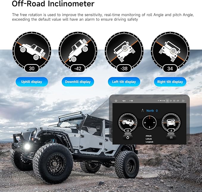- 【Off-Road Inclinometer Functions】Dasaita head unit built-in gyro sensor, the free rotation is used to improve the sensitivity; it monitors the vehicle's roll and pitch angles in real time and issues an alarm when they exceed the preset values to ensure driving safety; even on winding mountain roads, the inclinometer can provide intelligent vehicle stability control and driving assistance functions, thereby improving driving safety and experience