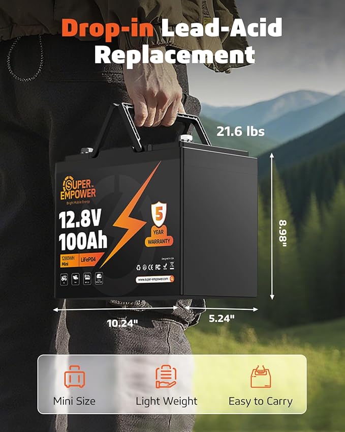 - 【Drop-in Replacement for Lead-Acid Batteries】 Dimensions: 10.2”x5.2”x9.0”, Weight: 21.6 lbs. With a BCI Group 24 size and M8 terminals, it fits seamlessly into most standard battery boxes without modifications. The 12V 100Ah LiFePO4 lithium battery from SUPER EMPOWER is a true drop-in replacement for traditional lead-acid, AGM, or SLA batteries, making it ideal for RV, boat, or solar applications. Simply install and enjoy a longer-lasting, more efficient power source.