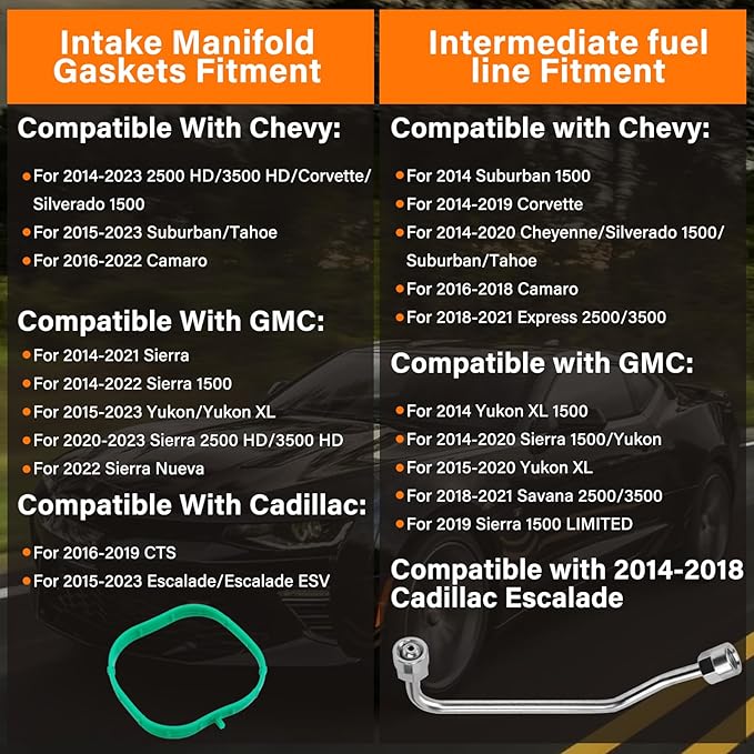 - Intake Manifold Gaskets Fitment: Compatible With Chevy: For 2014-2023 2500 HD/3500 HD/Corvette/Silverado 1500 | For 2015-2023 Suburban/Tahoe | For 2016-2022 Camaro | Compatible With GMC: For 2014-2021 Sierra | For 2014-2022 Sierra 1500 | For 2015-2023 Yukon/Yukon XL | For 2020-2023 Sierra 2500 HD/3500 HD | For 2022 Sierra Nueva | Compatible With Cadillac: For 2016-2019 CTS | For 2015-2023 Escalade/Escalade ESV | Replace OEM Numbers: 12626354, MS19945, MS 97402