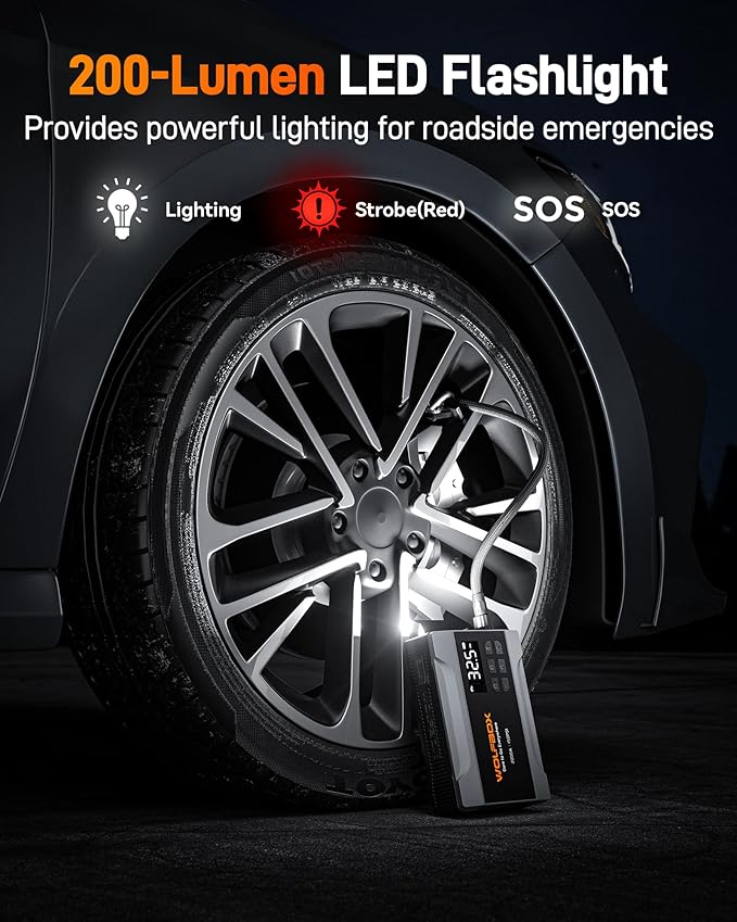 - Booster & 200 Lumen Lights - This car battery charger jump starter offers a powerful booster for starting vehicles in low voltage conditions, equipped with a 200-lumen LED flashlight with distress, strobe, and high beam modes, making it an essential emergency device. Its compact size fits easily in your car trunk or travel bag without taking up much space.