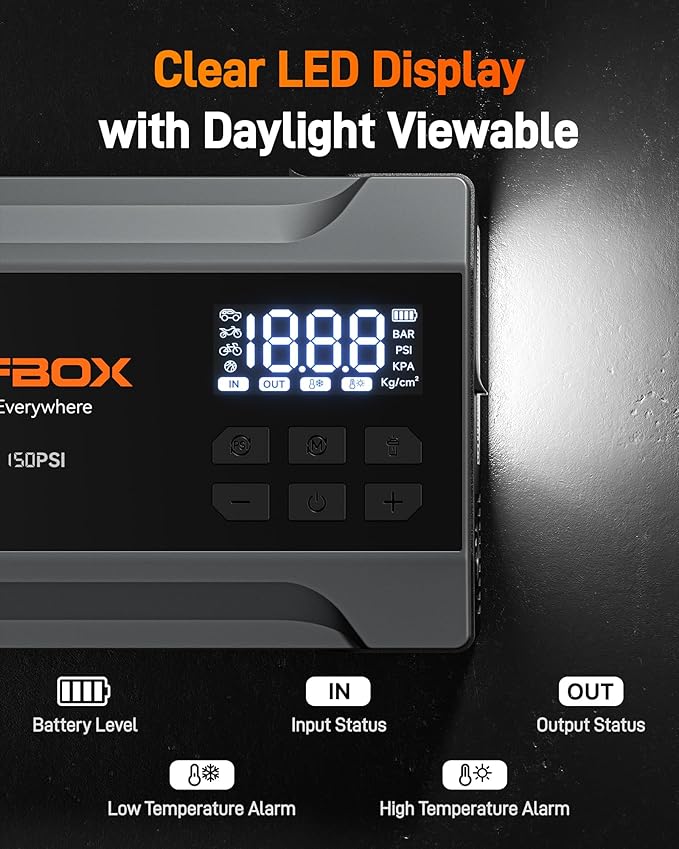 - Rapid-Inflate Cordless Air Compressor – This jump starter with air compressor offers real-time tire pressure detection and automatic stop inflation. With a max pressure of 150 PSI, it can inflate a 195/65 R15 tire from 29 to 36 PSI in 1 minute. Features 4 inflation modes (car, motorcycle, bicycle, basketball) and 4 pressure measurement units (BAR, PSI, KPA, kg/cm²) to meet your daily inflation needs.