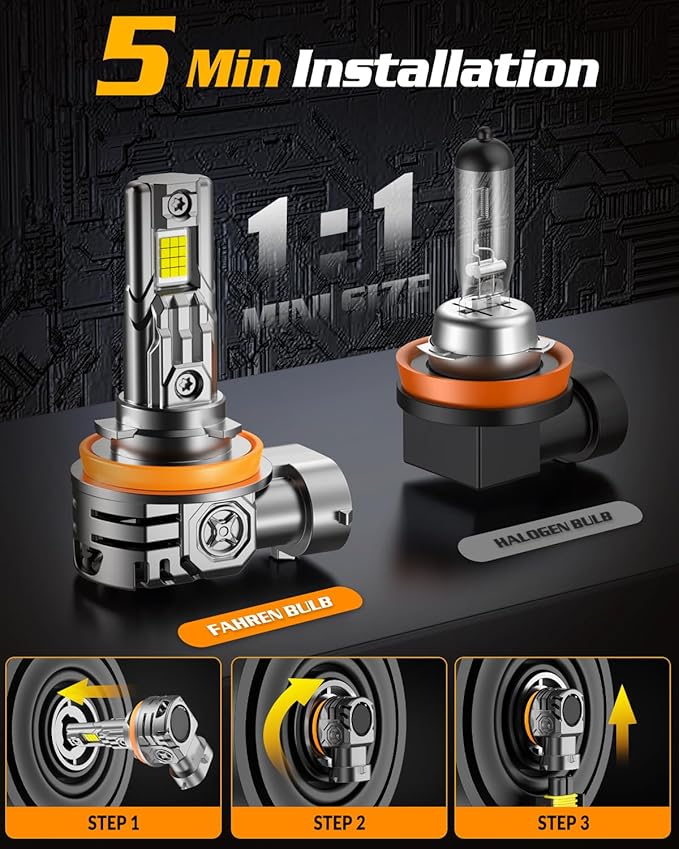 - 【Authentic 1:1 Mini Design】Unlike other LED bulbs, the H11 and 9005 LED Bulbs eliminate bulky heat sinks and external drivers. Through extensive testing and precise engineering, they achieve a precise 1:1 size match to halogen bulbs. Rest assured: spatial constraints within the lamp housing will not be an issue. The construction incorporates all-metal connectors for superior strength and longevity.