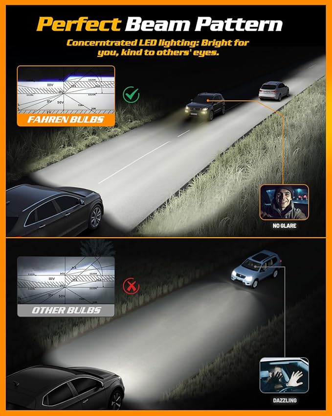 - 【Perfect Focused Beam】The H11 9005 LED bulb set, now upgraded, delivers an optimized beam pattern with a sharp cut-off line to prevent glare for oncoming traffic. Its ultra-thin 0.03-inch profile places the chips closer together, producing a super-concentrated beam free of dark spots and shadows, guaranteeing a broader and longer view for safer nighttime driving.