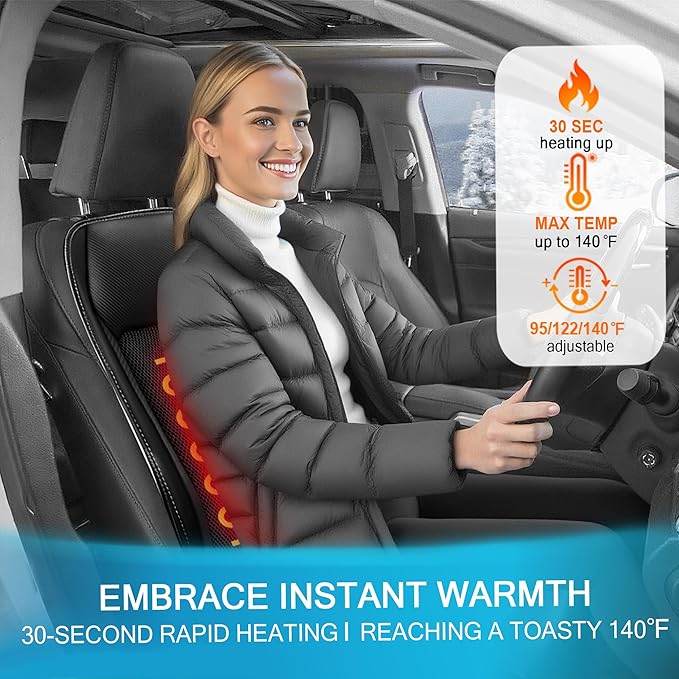 - 【3-in-1 Climate & Massage Comfort】Enjoy summer cooling with powerful air circulation, comfy temp for cold days, and soothing vibration massage targeting lower back tension—all in one versatile cooling car seat cover.