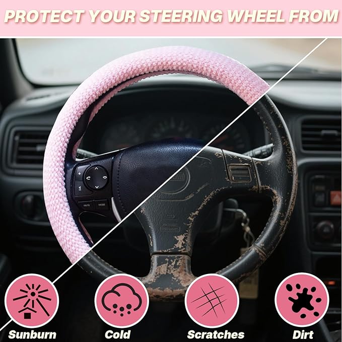 • Stylish and Decorative Upgrade​​:Refresh your car’s interior with this fashionable steering wheel accessories.Available in popular colors like pink, black,and beige,it matches various decors to personalize your space.The fuzzy appearance adds a modern,chic vibe, making driving more enjoyable.An affordable way to elevate your vehicle’s look while hiding scratches or wear.