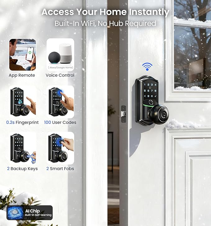 - Built-in Wi-Fi, Smarter Remote Access: Control your smart lock with door knob anytime, anywhere—no hub required. Use the KK Home App to unlock or lock remotely, manage user permissions, monitor real-time status, and get instant security alerts right from your phone