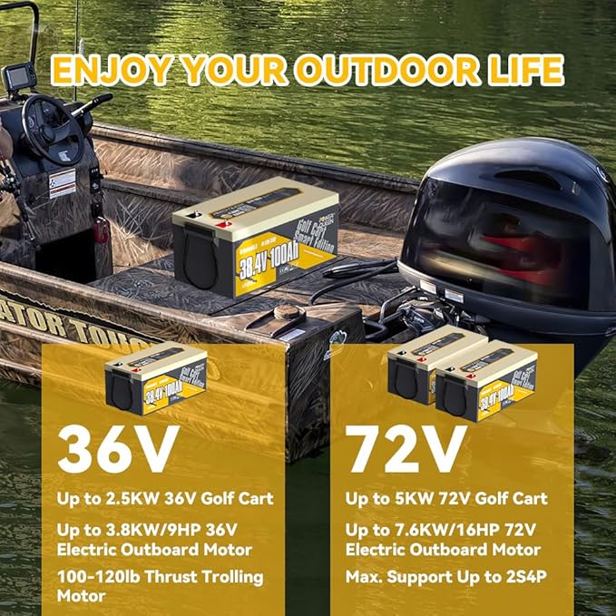- ⚡【High Horsepower Compatibility】 The 36V configuration supports a 3.84kW motor (9 HP), while the 72V setup can handle up to a 30.72kW motor (49 HP), making it ideal for high-performance electric outboard motors and golf carts
