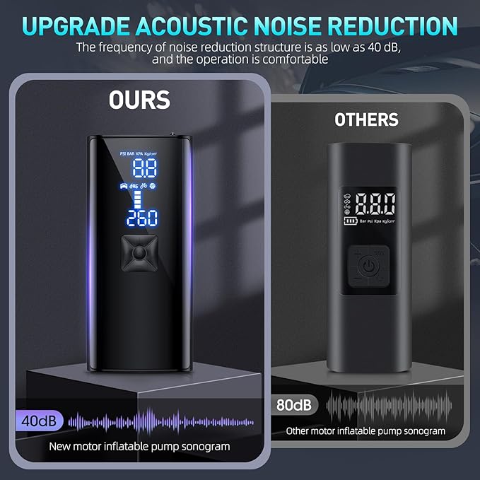 - Intelligent dual display: The car tire inflator has dual digital LCD screens, which can display real-time data on tire pressure and the preset tire pressure. When the tire pressure reaches a certain value, it will automatically stop. Don‘t worry about over-inflation