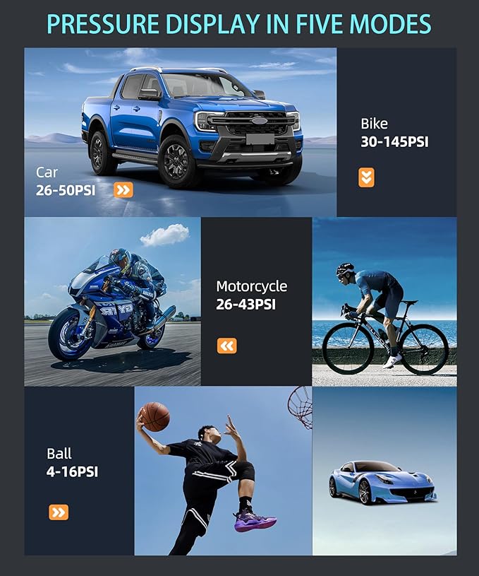 - 4+N perset mode: This portable air pump offers 4 pressure measurement units and 4 inflation modes, suitable for cars, bicycles, balls and motorcycles respectively. It also comes with a manual mode for users to adjust the values at will