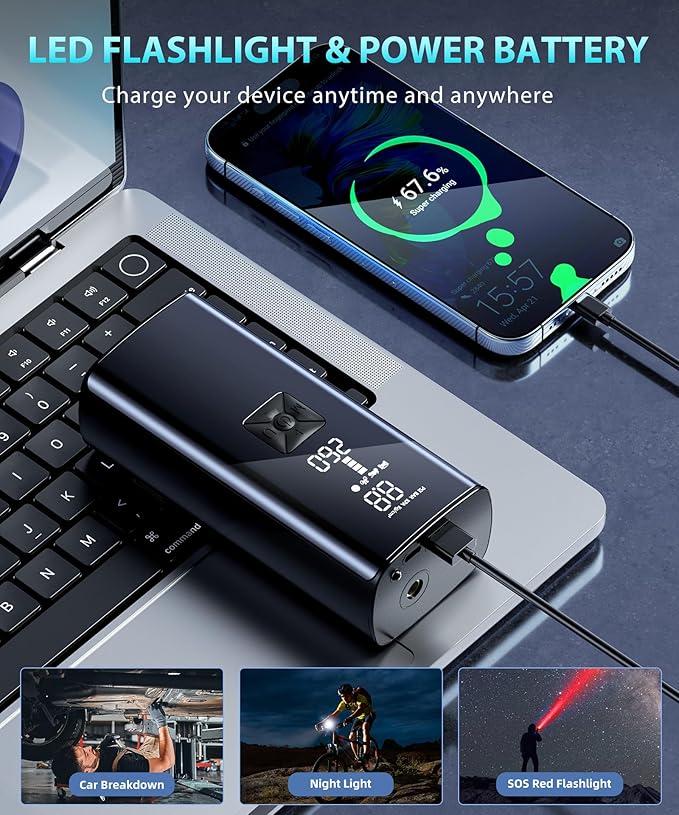 - Multifunctional tool: This tire inflator portable air compressor is equipped with a large-capacity battery and USB interfaces, which can charge other electronic devices. The LED light can also be used as a flashlight in dark lit environments