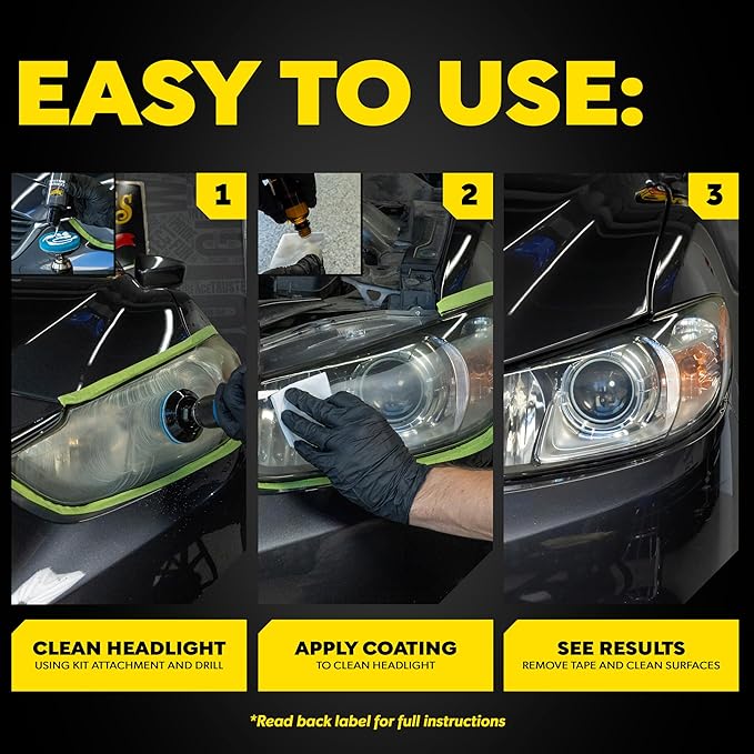 - EASY TO USE HEADLIGHT KIT: This headlight restoration system delivers results and is easy to use. Fix oxidized headlights by removing the severe yellowing with the power of your drill, followed by hand applying the coating for outstanding, pro results