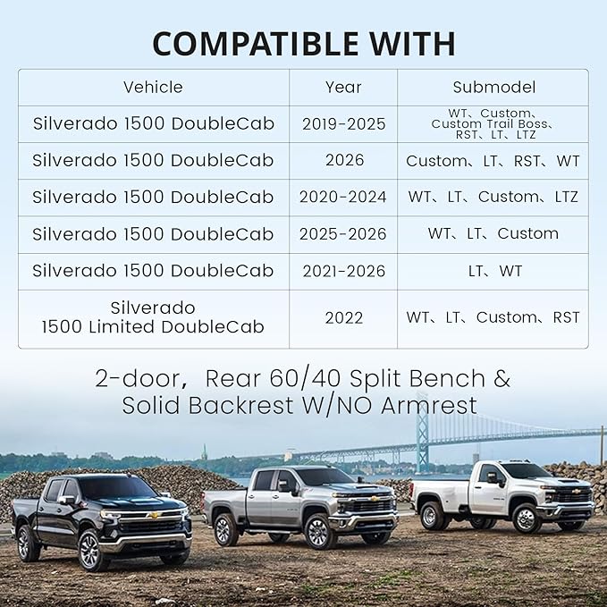 - Luxury Custom Fit: Car seat covers tailored for 1)2019-2025 Silverado 1500 DoubleCab WT, Custom, Custom Trail Boss, RST, LT,LTZ;2)2026 Silverado 1500 DoubleCab Custom、LT、RST、WT;3)2020-2024 Silverado 2500 DoubleCab WT、LT、Custom、LTZ;4)2025-2026 Silverado 2500 DoubleCab WT、LT、Custom;5)2021-2026 Silverado 3500 DoubleCab LT、WT;6)2022 Silverado 1500 Limited DoubleCab WT、LT、Custom、RST ,2-door,Rear 60/40 Split Bench &Solid Backrest W/NO Armrest. fits like a glove, sleek & stylish.