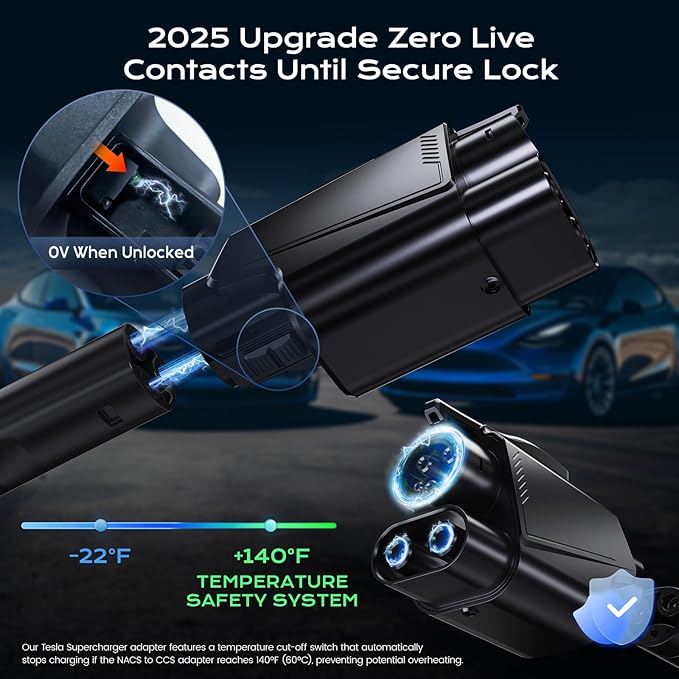 - 【ZERO Safety Hazards】This NACS to CCS1 adapter features a temperature-cutting switch to ensure user and vehicle safety. If the voltage or current is too high during charging with temperature reaches 140°F (60°C), the switch will automatically stop charging and resume normal operation after the temperature returns to normal.