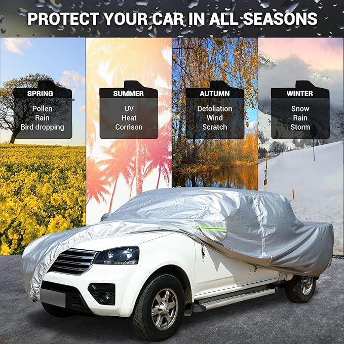 - All-Round Weather Protection: Designed for all-season use, the Tecoom truck cover shields your vehicle from sun, rain, snow, frost, bird droppings, sand, dust, leaves, and even industrial pollution. Ideal for both indoor and outdoor use, it is stain-resistant and easy to clean—simply wipe with a damp cloth to remove dirt effortlessly